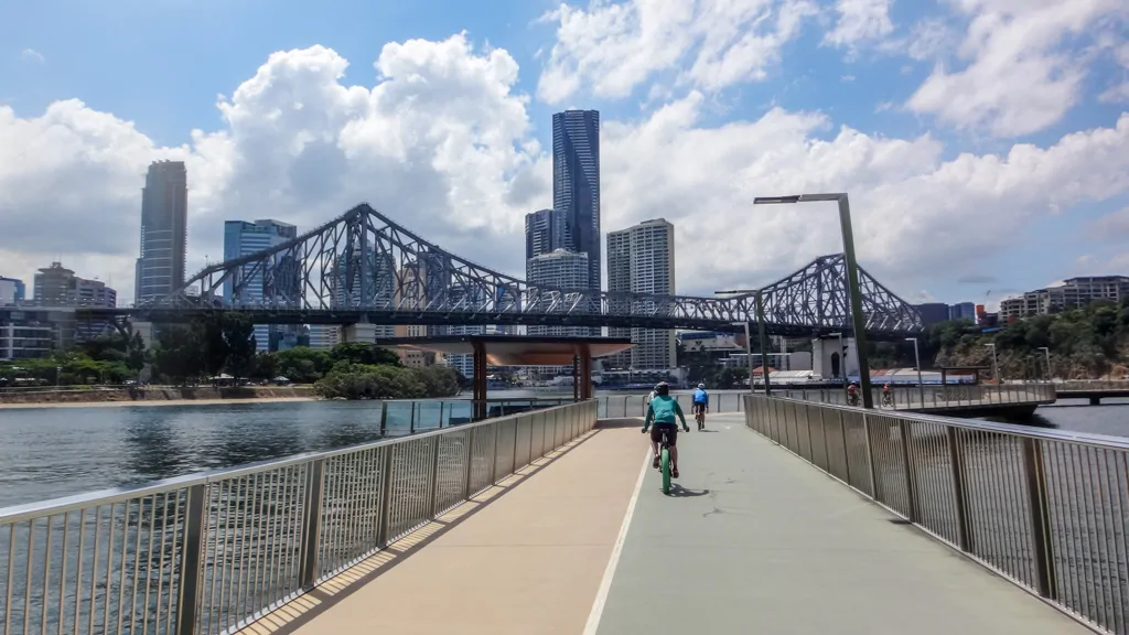The bike path followed the Brisbane River upstream. As we rounded a final bend in the river, the city came into view behind the Story Bridge.